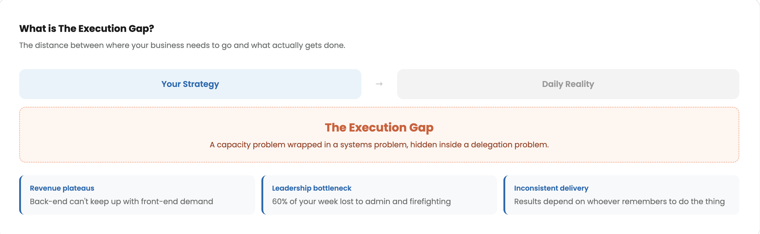 The Execution Gap is the space between strategy and reality. It’s what happens when a founder or leadership team has clarity on where the business should go but lacks the operational capacity to get there consistently.